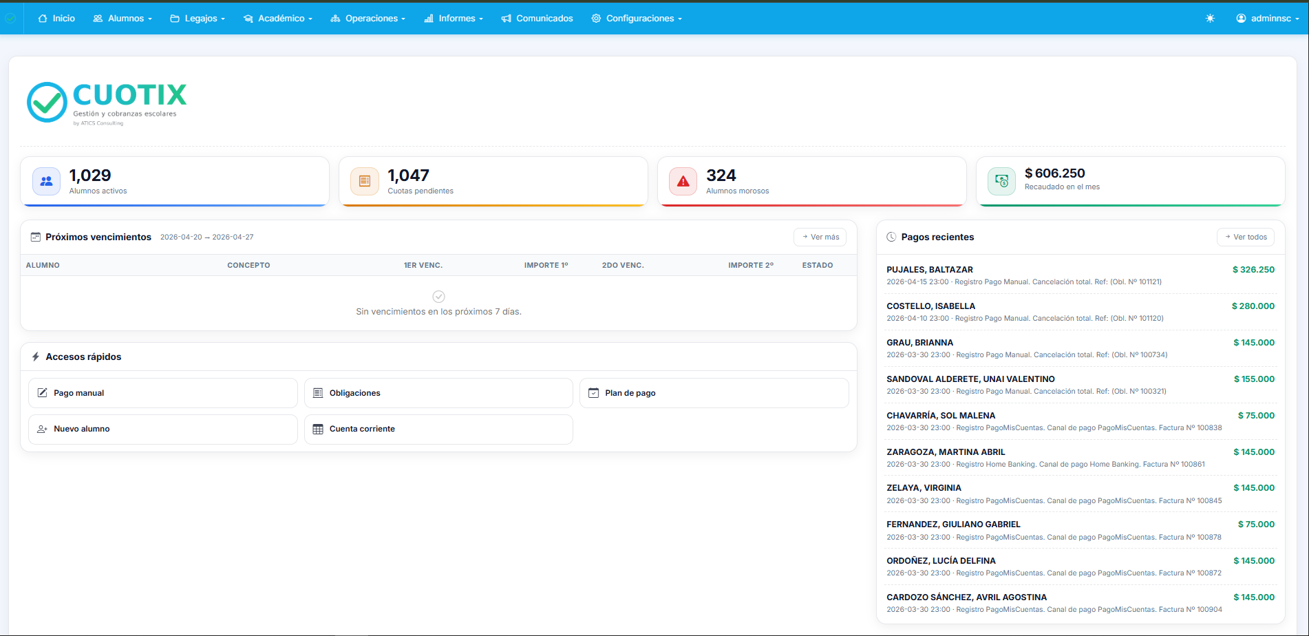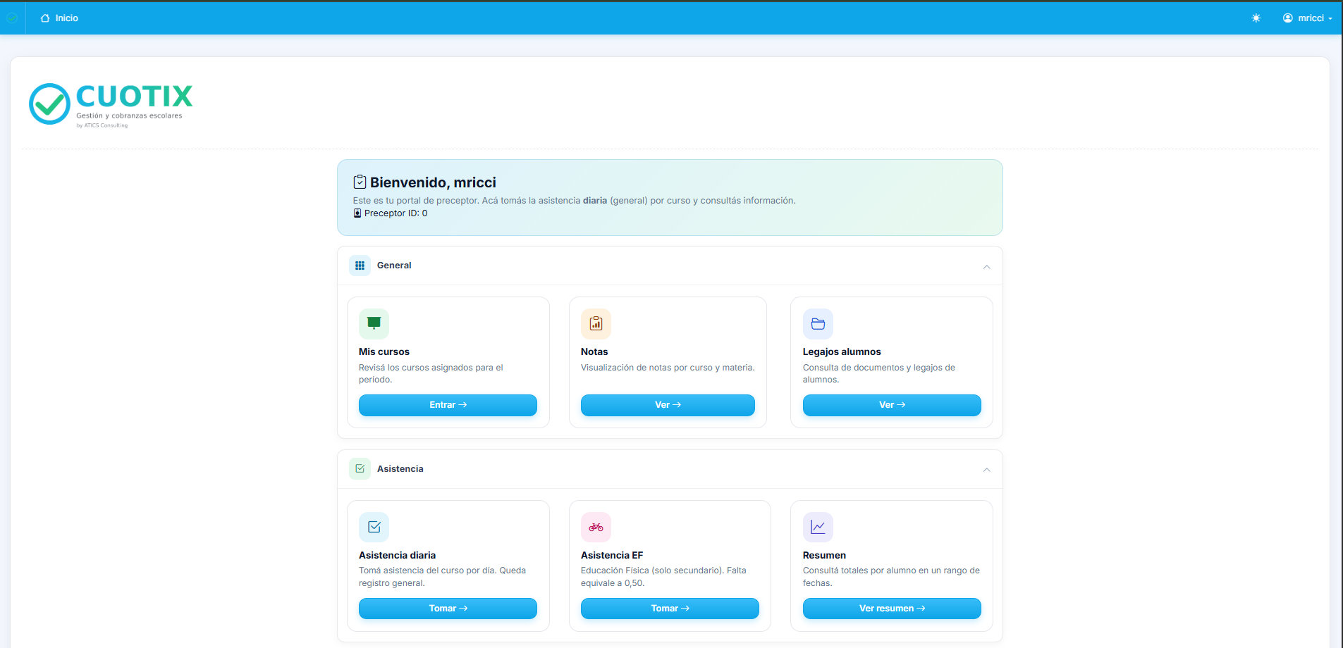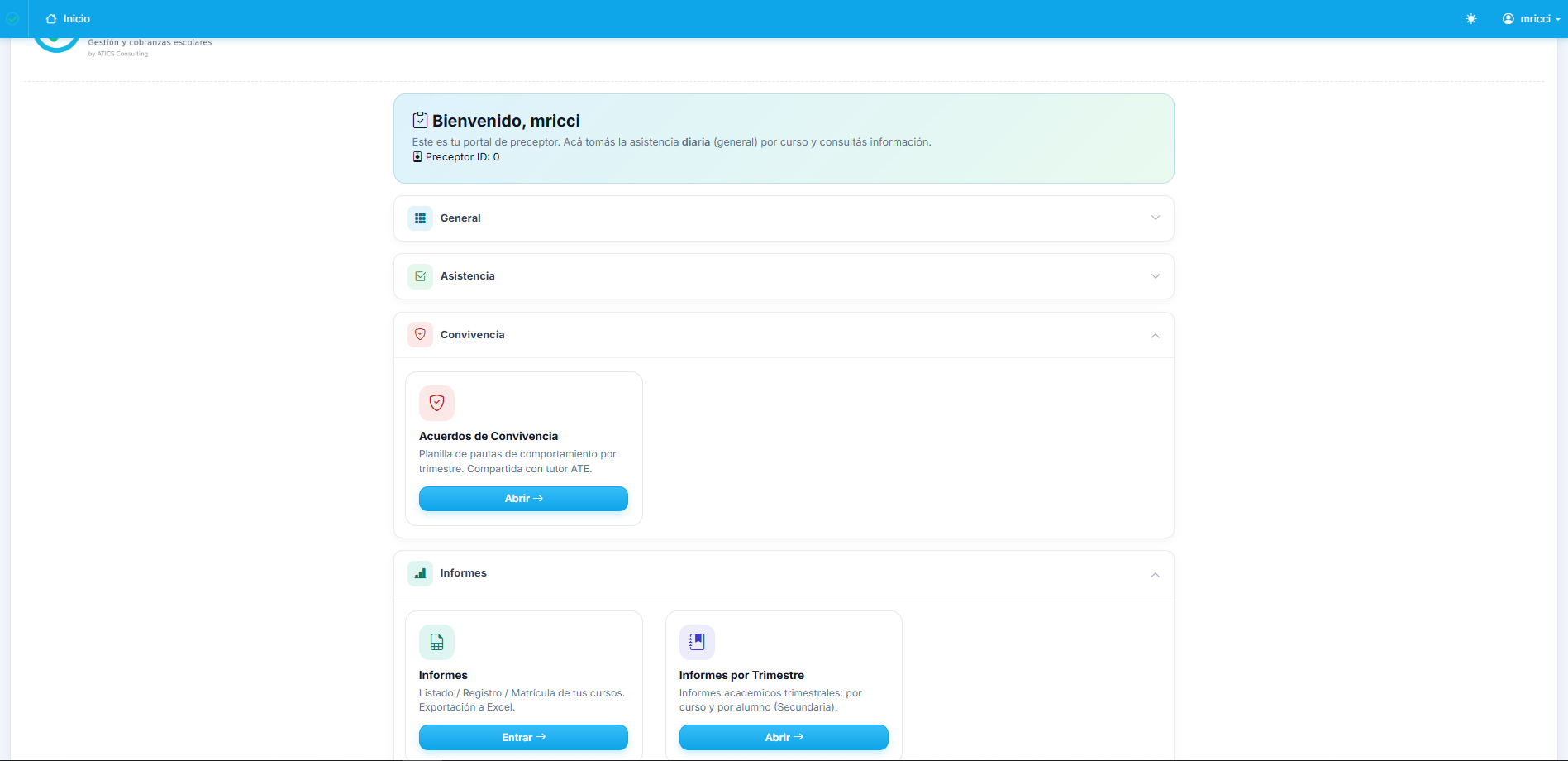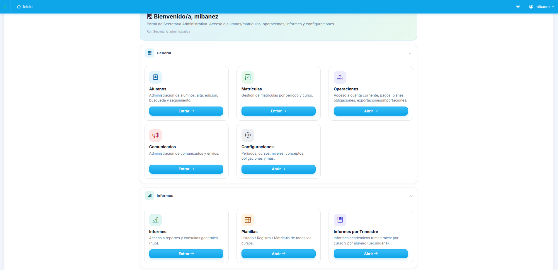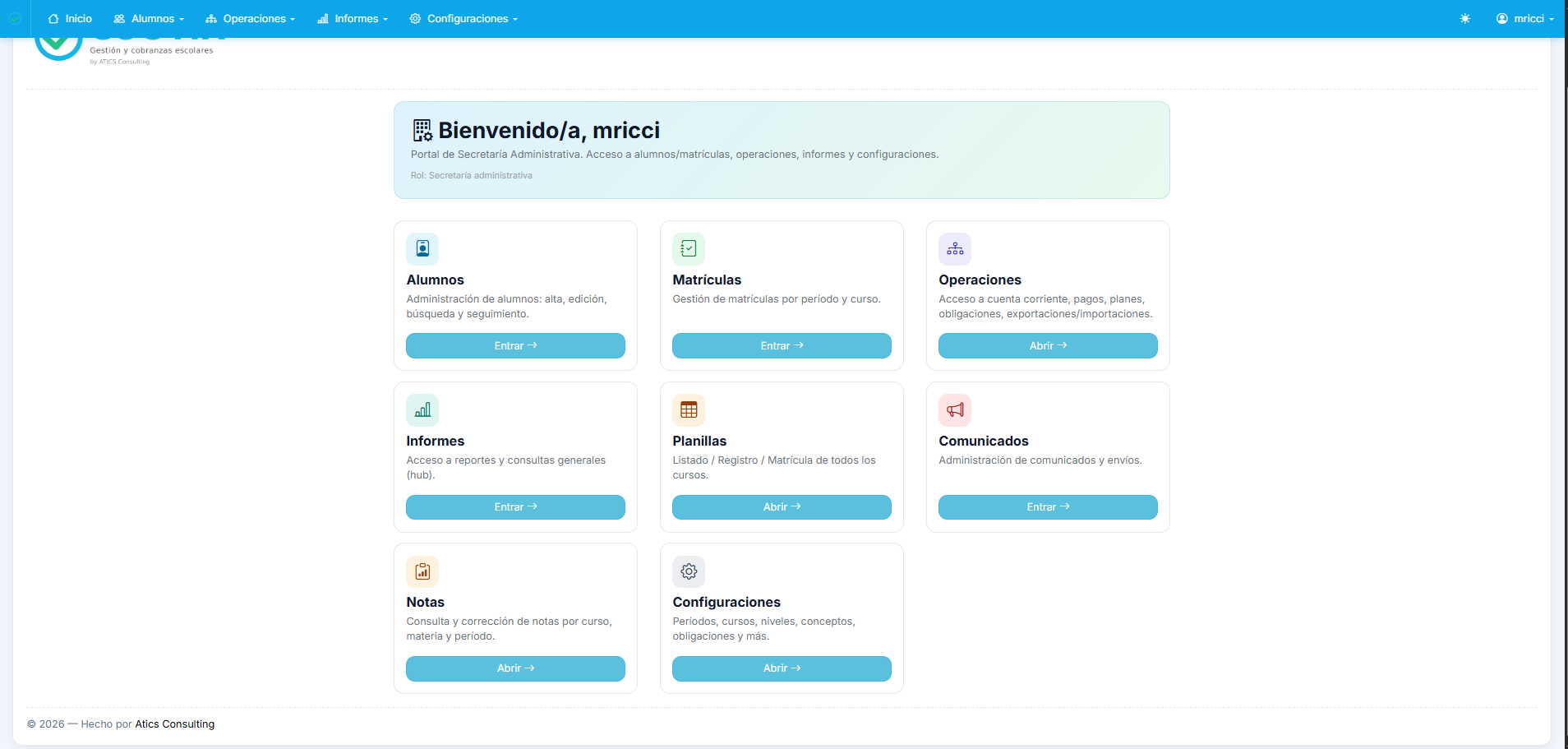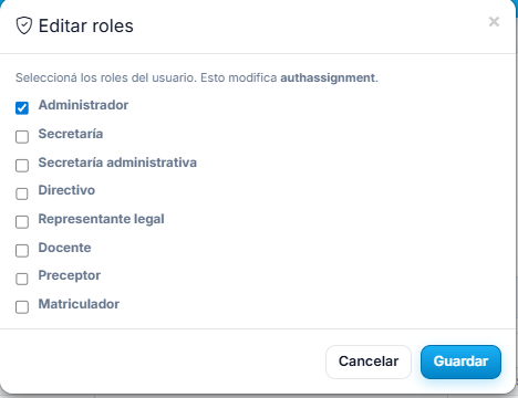 Administrador, Directivo, Secretaría, Secretaría administrativa, Representante legal, Docente, Preceptor y Matriculador. Cada perfil ve lo que necesita. Gobernanza sin anarquía.